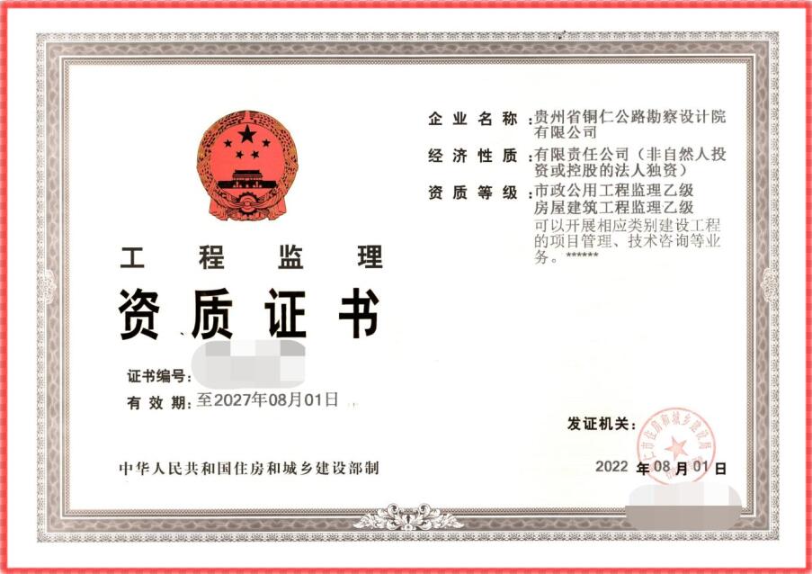 8月1日,贵州省铜仁公路勘察设计院有限公司(以下简称公司)取得房建、市政工程监理乙级资质证书。截至目前,公司已拥有工程设计公路行业专业乙级,市政行业(桥梁工程、道路工程、给水工程、排水工程)专业乙级,工程勘察(岩土工程勘察、工程测量)专业乙级,工程咨询乙级、工程测绘乙级和工程监理(房屋建筑工程、市政公路工程)乙级等多项资质证书。